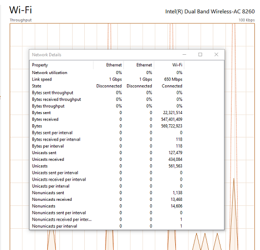 Hey, so as of yestarday, 10/20/19, for some reason task manager decided to stop showing network utilization, and keep it at 0% for everything. I checked the network details in the performance tab for network, and here is what it looks like. I have a wireless connection, and it has never acted up until now. Im pretty sure this has something to do with windows but im not sure. I have tried a lot, I have tried updating my computer, restarting it, and nothing really worked. The main reason I am concerned is I think it is effecting packet loss in games. I pinged google in cmd (around 20 times) and had no packet loss though, but in games it shows a 5% packet loss at times, which is not normal. My ping stays around 20-40, but everytime I do something the packets get loss. I am not sure if these 2 issues are connected, but they started on the same day. Also, you can see the graph a little in the background. For some reason, it spikes up randomly with around 100 kbps, for no reason. Im pretty sure thats it, but I will probably be trying to fix it, so I might come up with new info or a solution.